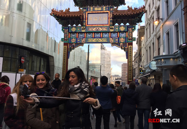 三名英国女孩在伦敦唐人街“英伦吉祥”的牌楼前自拍,目前有50万华人华侨和留学生生活在英国。红网伯明翰4月20日讯(特派记者 喻向阳)“哦!你们来自毛泽东家乡啊?知道,那里有个Shaoshan(韶山),我去过。”4月18日至20日,在伯明翰国家展览中心举行的2016英国国际食品及饮料展上,来自湖南的参展企业得到了英国客商Geoff Mearedith的关注。